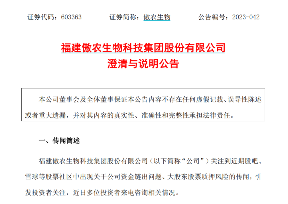 傲农生物称,公司关注到近期股吧、雪球等股票社区中出现关于公司资金链出问题、大股东股票质押风险的传闻,多位投资者来电咨询相关情况。目前,该公司经营情况正常,资金状况正常,定增工作目前进展顺利。
