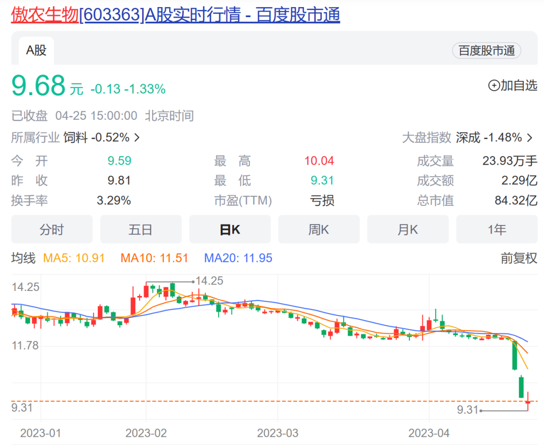连续两个交易日大跌后,4月25日早盘,傲农生物(603363)股价再现显著下行,不过当日午后跌幅已有所收窄,收跌1.33%,近三个交易日累计跌超20%。