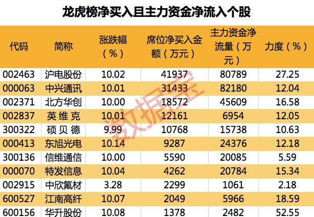 速看!龙虎榜净买入且主力资金净流入个股一览