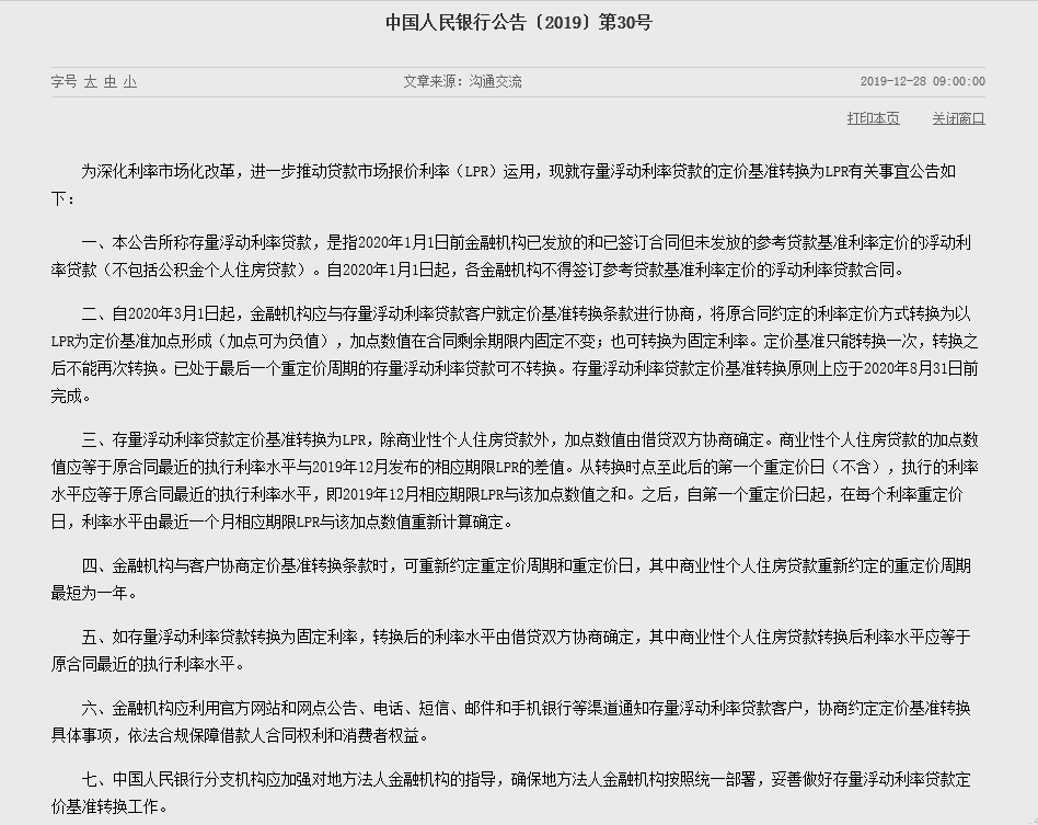 央行周末也不休息,12月28日,央行发布公告称,为进一步深化LPR改革,商业银行应自2020年3月1日起正式切换存量浮动利率贷款定价基准,原则上存量贷款利率定价基准切换工作要在2020年8月31日前全部完成。