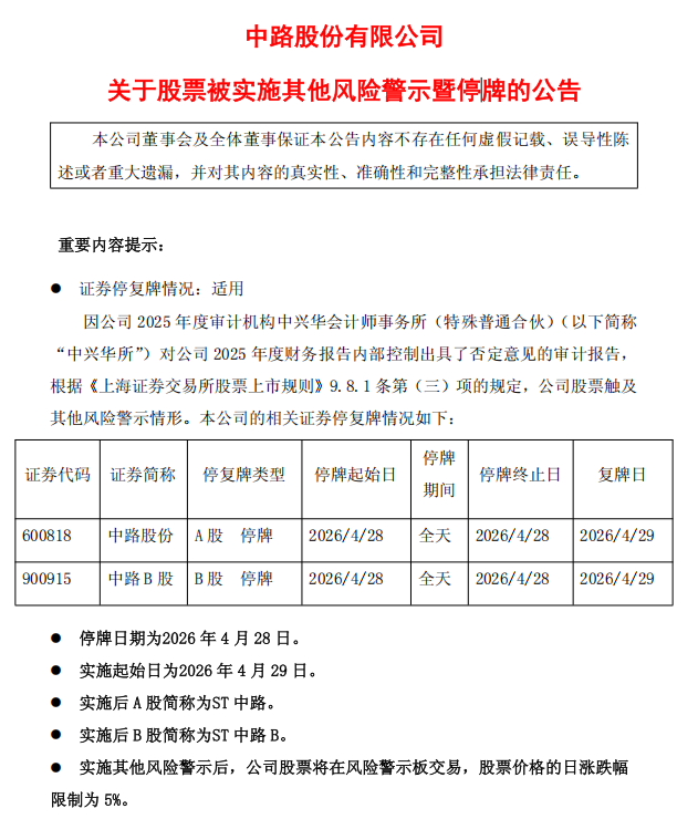 中路股份4月27日晚公告称,因公司2025年度审计机构中兴华会计师事务所对公司2025年度财务报告内部控制出具了否定意见的审计报告,根据《上海证券交易所股票上市规则》相关规定,公司股票触及其他风险警示情形。公司股票及债券将于4月28日停牌一天,4月29日起实施其他风险警示。