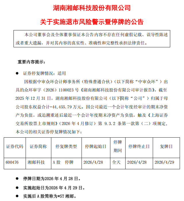 湘邮科技4月27日晚公告称,因公司2025年度经审计的期末归属于母公司股东权益为-4.45亿元,触及上交所股票上市规则规定的退市风险警示情形。公司股票于4月28日停牌一天,4月29日起实施退市风险警示,证券简称变更为“*ST湘邮”。
