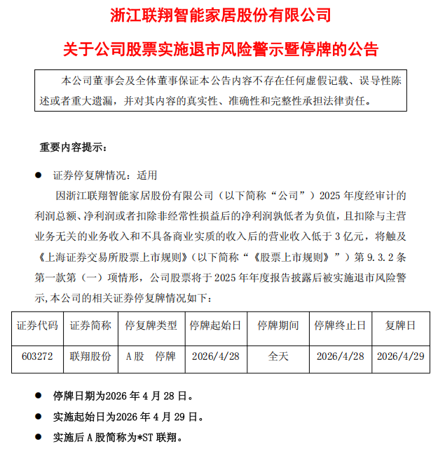 联翔股份同日晚间发布公告称,因公司2025年度经审计的净利润等指标为负值,且扣除与主营业务无关的业务收入和不具备商业实质的收入后的营业收入为1.27亿元,低于3亿元,触及退市风险警示情形。公司股票将于4月28日停牌1天,4月29日起被实施退市风险警示,A股简称变更为“*ST联翔”,日涨跌幅限制为5%。