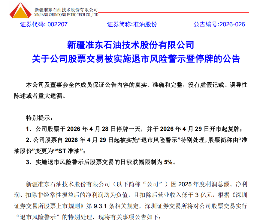 准油股份4月27日晚发布公告,因公司2025年度利润总额、净利润及扣非净利润均为负值,且扣除后营业收入低于3亿元,触及深交所退市风险警示情形。公司股票于4月28日停牌一天,自4月29日开市起复牌,并实施“退市风险警示”,股票简称由“准油股份”变更为“*ST准油”,日涨跌幅限制为5%。