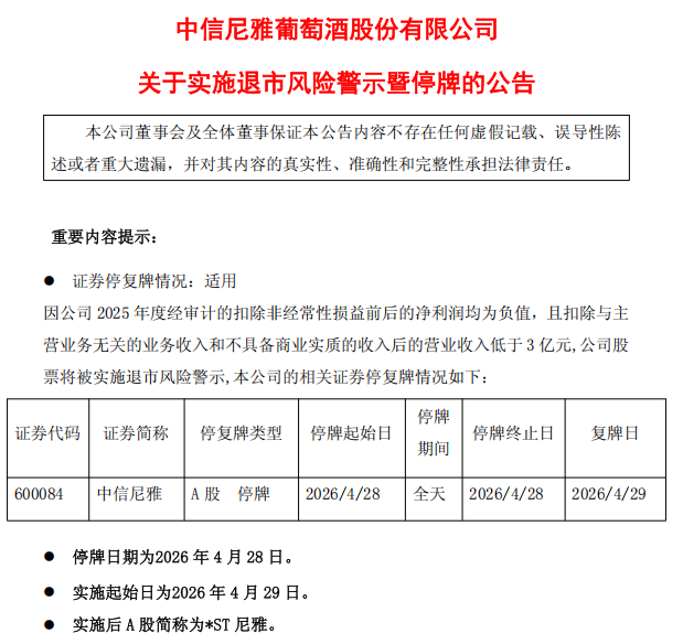中信尼雅4月27日晚发布公告称,因公司2025年度经审计的扣非净利润等均为负值,且扣除与主营业务无关的业务收入和不具备商业实质的收入后的营业收入低于3亿元,公司股票将被实施退市风险警示,于4月28日停牌1天,4月29日起被实施退市风险警示,A股简称变更为“*ST尼雅”,股票日涨跌幅限制为5%。