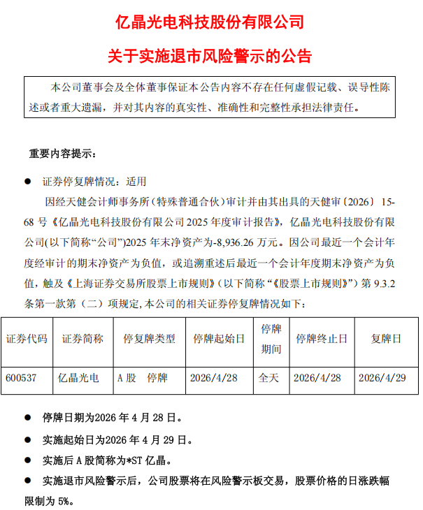 亿晶光电4月27日晚披露公告称,因公司2025年末经审计净资产为-8936.26万元,触及《上海证券交易所股票上市规则》规定的财务类强制退市情形,公司股票将于4月28日停牌一天,自4月29日起实施退市风险警示。