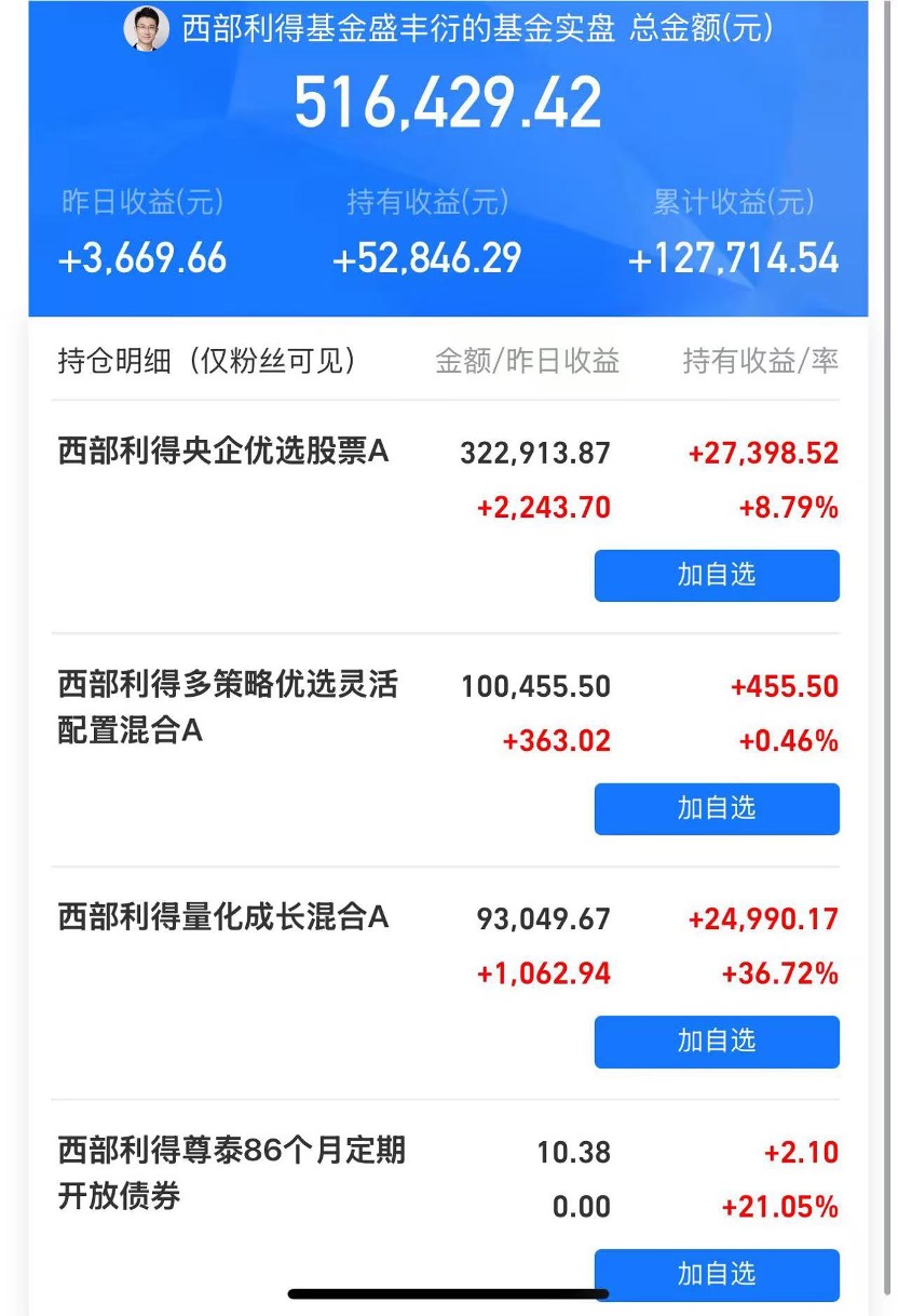 西部利得央企优选成立于2024年12月,成立以来回报率为22.34%。日前,盛丰衍公开晒实盘,其中,他持有金额最多的也是这只产品,自购30万,截至8月25日,持有收益率为8.79%。