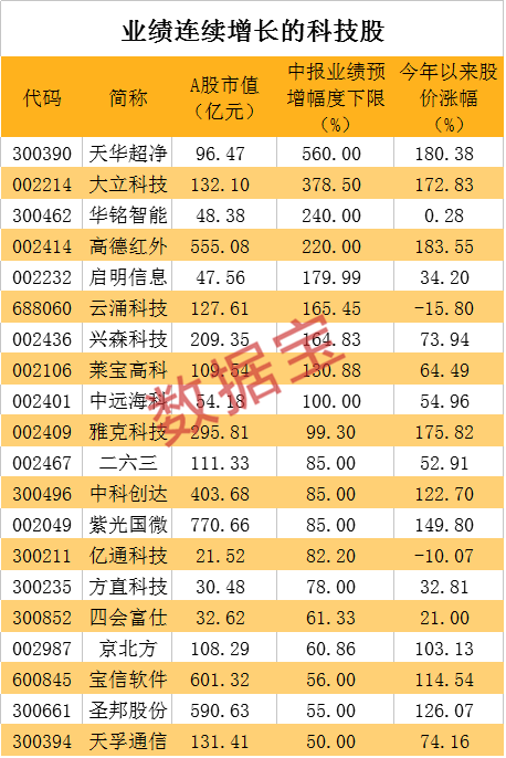 随着中报业绩预告披露,一批绩优科技股颇受追捧,业绩的持续增长是股价长牛的基本保障。证券时报·数据宝统计,在已披露了中报业绩预告的科技股中,业绩增幅下限超过50%且2018、2019年均实现业绩增长的个股共有20只,今年以来股价平均上涨了85%。