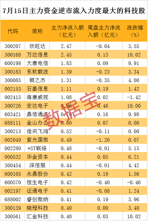 大跌行情下,仅有不足80只科技股获主力资金净流入,其中欣旺达、万达信息、大唐电信、东软载波和银之杰获主力资金流入金额最高,均超过1.3亿元。
