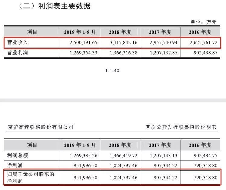招股书显示,2019年1-9月,京沪高铁营收250.02亿元,净利润95.2亿元;2016-2018年,其营收分别为262.58亿元、295.55亿元、311.58亿元;净利润分别为79.03亿元、90.53亿元、102.48亿元。