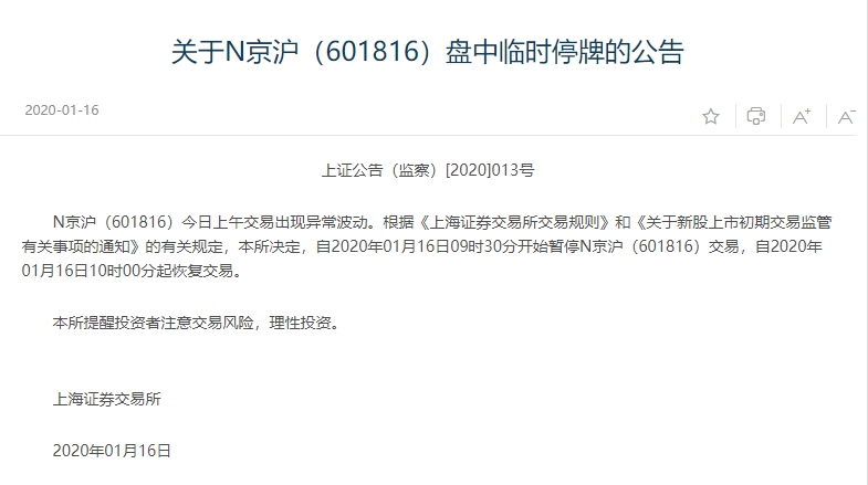 今日上市,京沪高铁在集合竞价期间高开20.08%,报5.86元,买一约160万手。开盘后,该股涨幅扩大至43.24%触发临停,报6.99元。