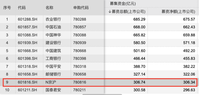京沪高铁此次IPO募资总额为306.74亿元,仅次于上个月邮储银行的327.14亿元,从募资额来看也是A股历史上第9大IPO。
