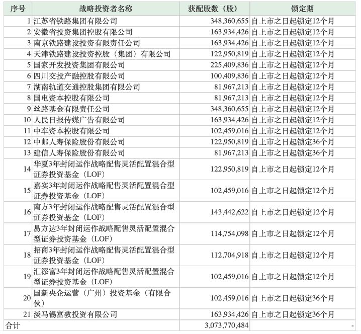 京沪高铁此次IPO公开发行62.86亿股,战略配售30.74亿股,约占本次发行股份数量的48.90%。结果显示,共有21个战略投资者获配股份,锁定期在12个月或36个月。
