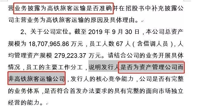 此前证监会曾对递交IPO的京沪高铁问询,是否为资产管理公司而非高铁旅客运输公司?对此京沪高铁回复称,人均管理资产规模较大,与采用委托运输管理模式相适应,但公司仍承担了运输过程中质量评定、信息反馈、质量改进等专业性工作。
