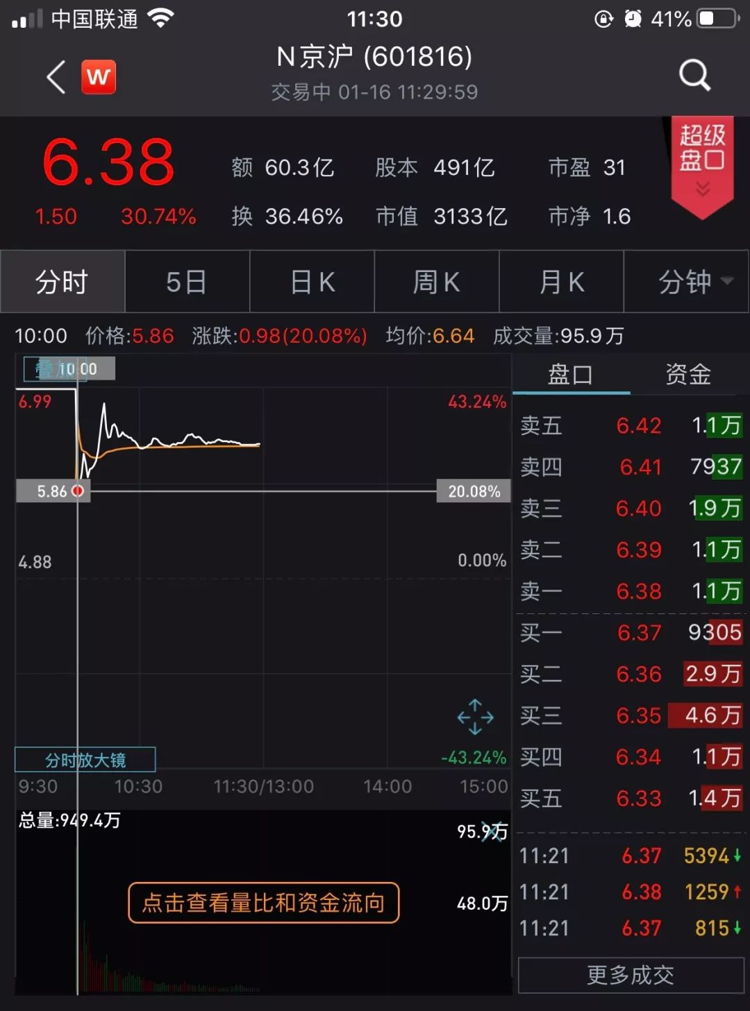 集合竞价期间,京沪高铁高开20.08%,开盘后涨幅扩大至43.24%触发临停,恢复交易后股价跳水走低,最终早盘收盘报6.38元,涨幅收窄至30.74%。