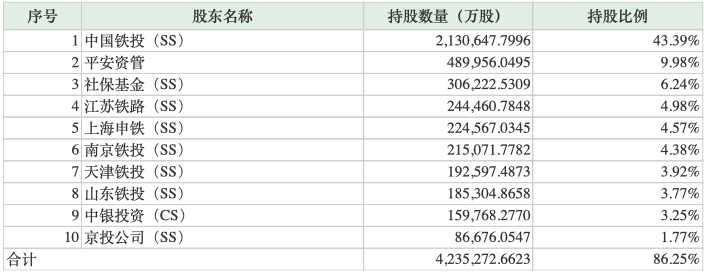 平安资管为第二大股东,持股9.98%,社保基金持股也超5%;此外,江苏铁路、上海申铁、南京铁投、天津铁投、山东铁投、中银投资、京投公司等位列前十大股东。