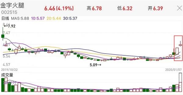 更让人想不到的是,第二天(1月6日)金字火腿股价一路上涨,并最终以涨停收盘,市值增长5.48亿元。今天(1月7日)金字火腿上涨的势头还在延续,截至午间休盘,涨4.19%。