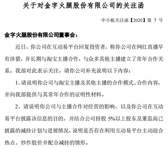 但是恰逢网红概念股大涨,金字火腿的表态引起了市场的质疑。1月3日晚间,深交所围绕上述回复向金字火腿下发关注函,要求金字火腿说明与淘宝主播及其他主播的合作模式、合作内容,并提供与主播常年合作的证明性材料。