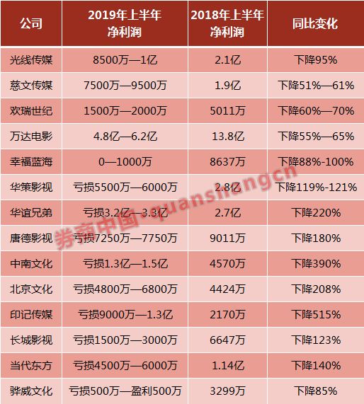 光线传媒的惨淡经营,只是影视行业的冰山一角。从半年报预告来看,华策影视、华谊兄弟、唐德影视、中南文化、北京文化、印记传媒、长城影视、当代东方、骅威文化等9家出现亏损,光线传媒、慈文传媒、欢瑞世纪、万达电影、幸福蓝海5家业绩腰斩。