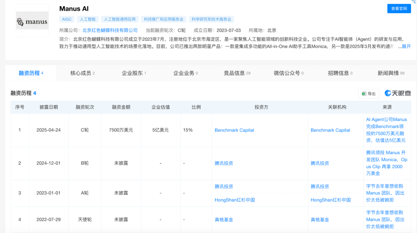 天眼查的信息显示,Manus共完成了4轮融资,投资者包括腾讯投资、红杉中国等。