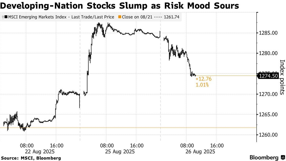 美国总统特朗普对美联储施压及重启全球贸易紧张局势,引发市场避险情绪升温,亚洲交易时段新兴市场股市与货币集体承压。摩根士丹利资本国际新兴市场股票指数下跌0.9%,终止了此前向三年多高点攀升的势头;MSCI发展中国家货币指数同步下滑0.3%,其中韩元成为主要拖累项。