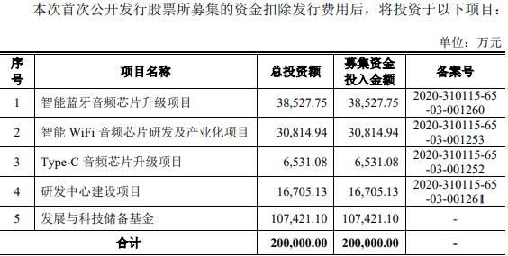 恒玄科技本次拟发行不低于3000万股,募集资金20亿元,用于智能蓝牙音频芯片升级项目等5个项目。
