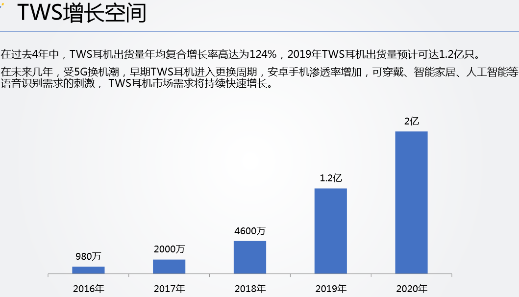 创道咨询合伙人步日欣认为,在过去4年中,TWS耳机出货量年均复合增长率高达为124%,2019年TWS耳机出货量可达1.2亿只,预计2020年达到2亿只。