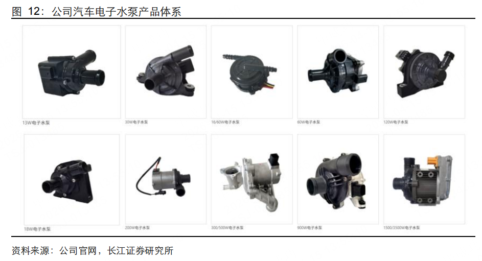 历经10多年开发,已形成完备产品体系。目前产品功率范围从13W到40KW不等,高功率产品具备同行业领先优势。公司以电子水泵为切入点,向新能源汽车领域迈进,强力推广电子产品。