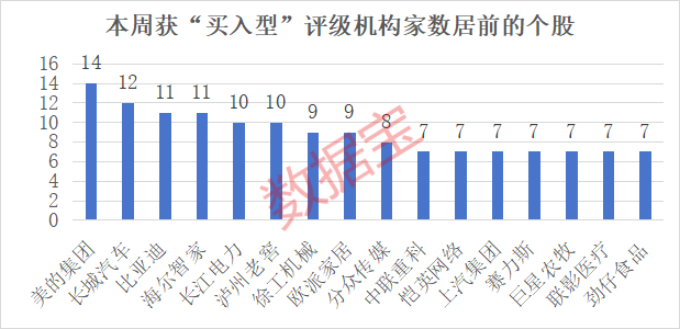 美的集团、长城汽车位居前两名,分别有14家、12家机构给予“买入型”评级;另外,比亚迪、海尔智家、长江电力、泸州老窖均获得10家及以上机构给予“买入型”评级。