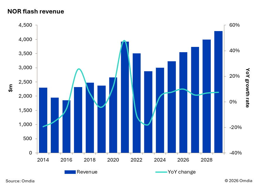预计NOR flash市场将在2026年稳步恢复至35.4亿美元,而非快速反弹。经过后疫情时代的修正后,需求持续正常化,但汽车行业仍低于峰值,工业需求正逐步改善。库存状况较一年前更为健康,但终端市场能见度仍然参差不齐。