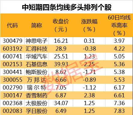 截至11月14日,87只个股5日、10日、20日、60日四条均线近日呈多头排列。其中神思电子、汇得科技(603192)、华域汽车(600741)股价与60日均线的乖离率最小,分别为3.97%、4.22%、5.05%。