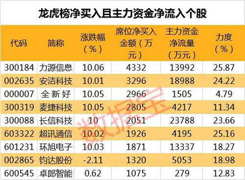 从盘口资金流向来看,主力资金净流入超千万且龙虎榜净买入个股共有11只,其中长信科技、安洁科技、力源信息等个股资金净流入金额最大。净流入力度最大的个股有印纪退、康弘药业(002773)、长生退,净流入力度分别为46.73%、27.61%、26.17%。