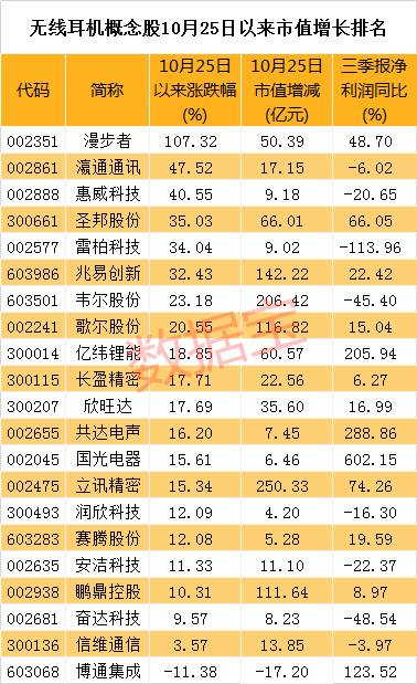 漫步者累计涨幅107.32%遥遥领先,为无线耳机题材当之无愧的龙头。此外,瀛通通讯(002861)、惠威科技(002888)、圣邦股份(300661)、雷柏科技(002577)、兆易创新、韦尔股份、歌尔股份等股10月25日以来累计涨幅超过20%。