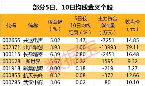 截至最新收盘,有7只A股的5日均线主动上穿10日均线,其中共达电声、北方华创(002371)、长盈精密(300115)等个股的5日均线较10日均线距离最大,分别达1.47%、1%、0.8%。