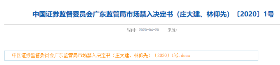 依据2005年《证券法》第二百三十三条和《证券市场禁入规定》(证监会令第115号)第三条的第一、七项及第五条的规定,广东证监局决定对庄大建采取10年证券市场禁入措施,对林仰先采取5年证券市场禁入措施,在禁入期间内,除不得继续在原机构从事证券业务或者担任原上市公司、非上市公众公司董事、监事、高级管理人员职务外,也不得在其他任何机构中从事证券业务或者担任其他上市公司、非上市公众公司董事、监事、高级管理人员职务。
