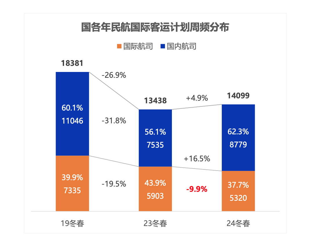 这其中,国际客运航班同比增长,国内客运航班则同比下降。据航班管家的统计,2024年冬春航季,民航客运航班周度计划航班量中,国内下降0.9%、国际增长4.9%、港澳台下降13.0%。