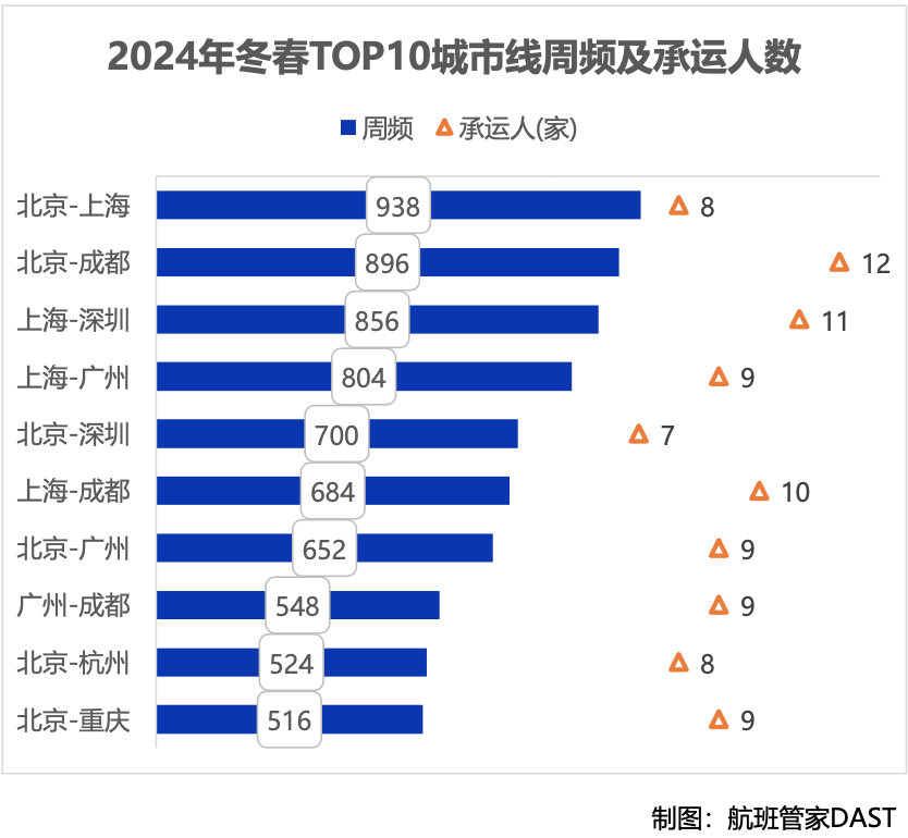 根据航班管家的统计,新航季最繁忙的10条城市线涉及北京、上海、广州、深圳、成都、重庆以及杭州7座城市,其中6条航线与北京有关。一度被称为航司“黄金航线”的北京-上海线周频排名第一,日均高达134班次,北京-成都线排第二,日均达128班次。十条城市线的竞争颇为激烈,承运人数皆在7家及以上,其中上海-深圳线达11家、北京-成都线高达12家。