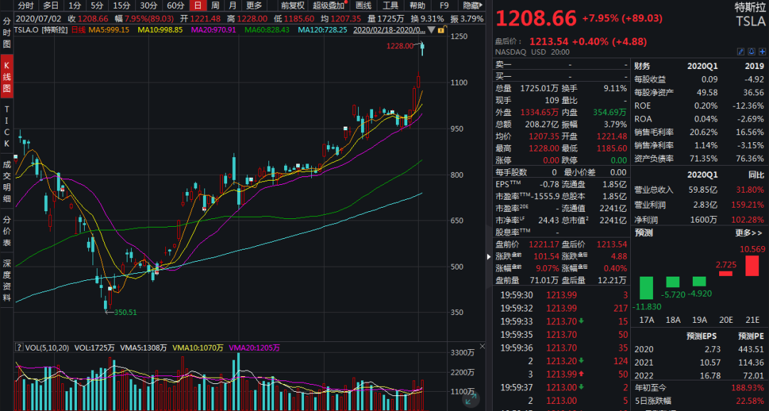 截至7月3日记者发稿,特斯拉股价达到1208.66美元/股,总市值高达2241亿美元,超越此前市值第一的汽车企业丰田汽车(2062亿美元)。