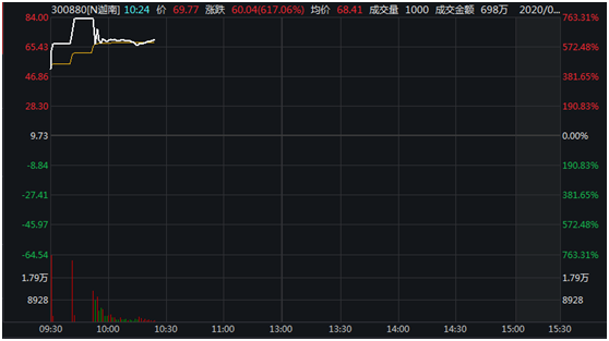 开盘后,三只新股均迅速触及30%、60%的临停线,然后急速回落;9:55左右,三者均开启震荡模式。截至午间收盘,迦南智能、大叶股份、盛德鑫泰分别报71.99元、68.11元、75.04元,较发行价大涨639.88%、543.76%、429.57%,动态市盈率分别为135倍、124倍、119倍。