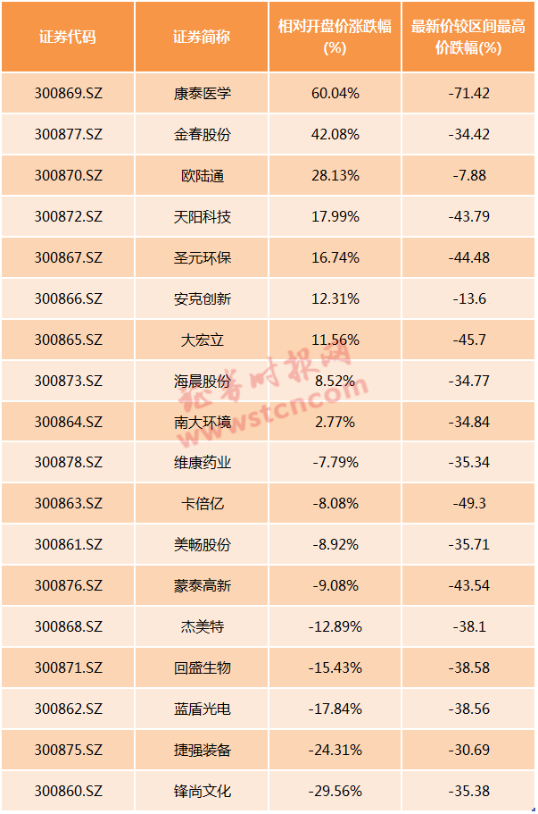 18只个股中,9股8月31日收盘价低于上市首日上市开盘价,其中杰美特、回盛生物、蓝盾光电等5股较上市首日开盘价跌幅超过10%,锋尚文化、捷强装备2股跌幅更是超过20%;上涨个股中,康泰医学以60.04%的涨幅排名首位,金春股份、欧陆通分列二三位,另外,天阳科技、圣元环保、安克创新等4股涨幅也超过10%。