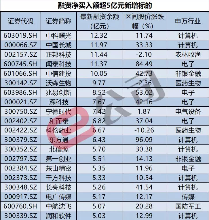 近来科技股行情普遍被看好,不难看出杠杆资金也盯上了这类股。不少个股获融资客抢筹,超四成新增标的融资净买入额超亿元,有20只个股的融资净买入额超5亿元。其中,中科曙光、中国长城、正邦科技、闻泰科技、中信建投的融资净买入额超10亿元。