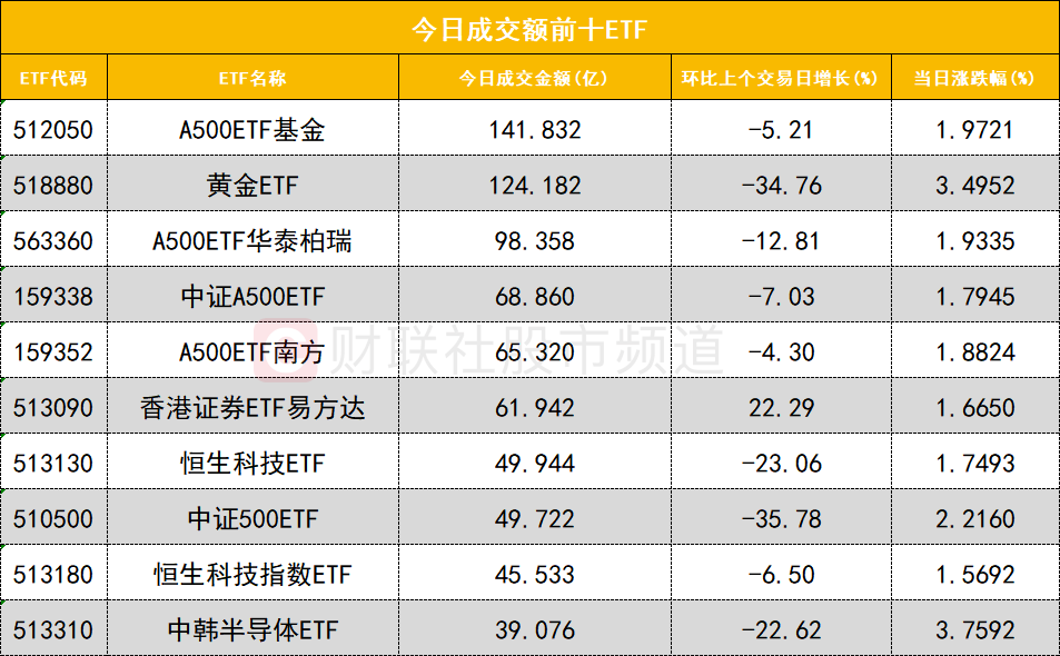 从成交额前十的ETF来看,A500ETF基金(512050)成交额位居首位,黄金ETF(518880)成交额位居次席。