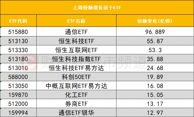 在上周份额增长前十ETF中,通信ETF(515880)上周份额增长96.889亿份位居首位;恒生科技ETF(513130)上周份额增长55.87亿份位居次席。