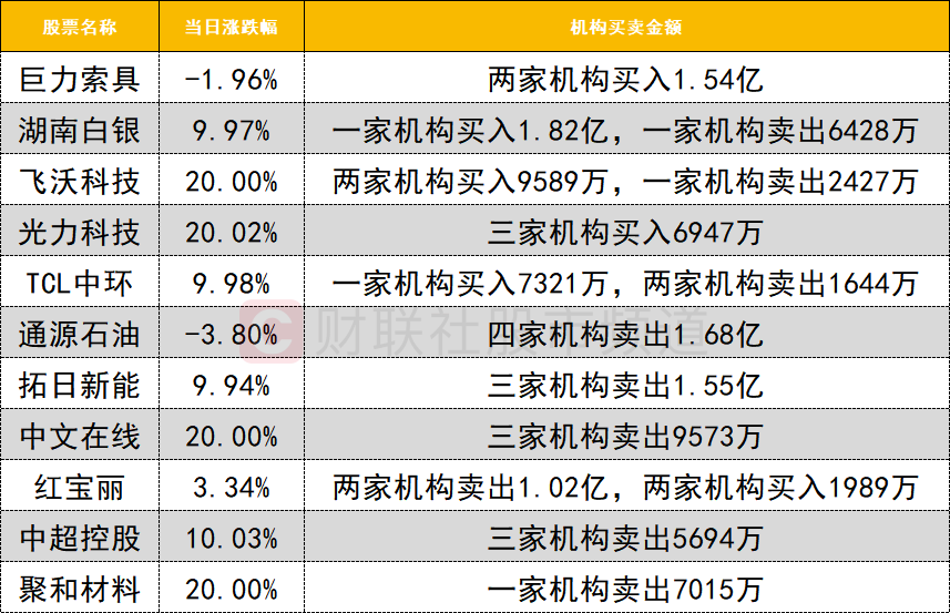 今日龙虎榜机构活跃度一般,买入方面,贵金属人气股湖南白银强势封涨停,获一家机构买入1.82亿。商业航天概念股获机构关注,其中巨力索具获两家机构买入1.54亿,飞沃科技获两家机构买入9589万。