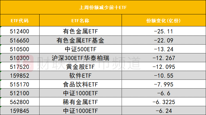 在上周份额减少前十的ETF中,多只有色金属相关ETF份额大幅减少,其中有色金属ETF(512400)上周份额减少25.11亿份位居首位。近期现货黄金和现货白银价格出现大幅波动,导致贵金属概念遭重挫,进而影响有色金属相关ETF的份额。