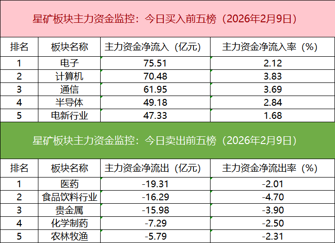从主力板块资金监控数据来看,电子板块主力资金净流入居首。