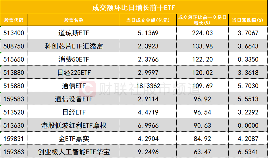 从成交额环比增长前十的ETF来看,道琼斯ETF(513400)成交额环比增长224%位居首位;科创芯片ETF汇添富(588750)成交额环比增长133%位居次席。