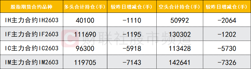 四大期指主力合约中,IH、IF、IC、IM合约多空双方均减仓,IH合约空头减仓数量较多。