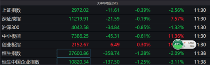 截至午间收盘,上证指数报2972.02点,下跌0.39%;深证成指报11219.91点,下跌0.19%;创业板指报2152.67点,上涨0.30%。