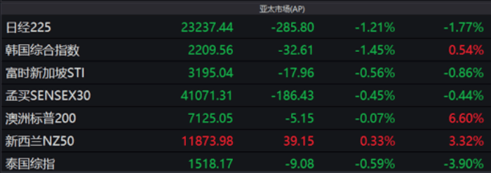 截至记者发稿,亚太主要市场指数多数下挫。日经225指数下跌1.2%,韩国综合指数下跌1.45%,新加坡、印度、泰国市场指数均出现不同程度下跌。